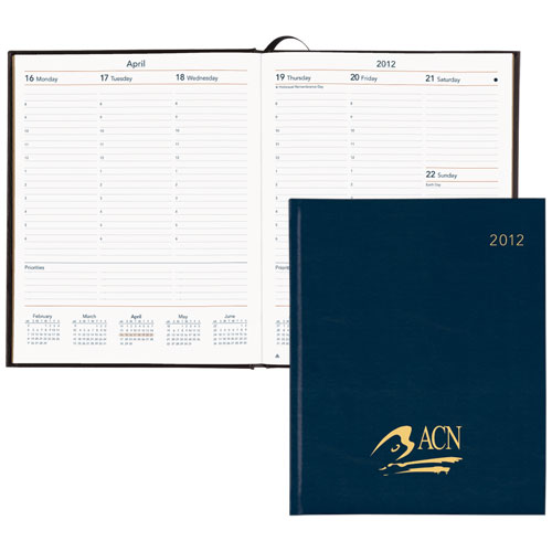 A 10" x 7 1⁄2" hard cover bonded leather desk planner with gilded edges and a ribbon marker. 168 pages, with section-sewn construction. Phone/address pages and helpful reference and information pages. Complementary weekly/monthly view format. Colors : Black & Black Cherry.