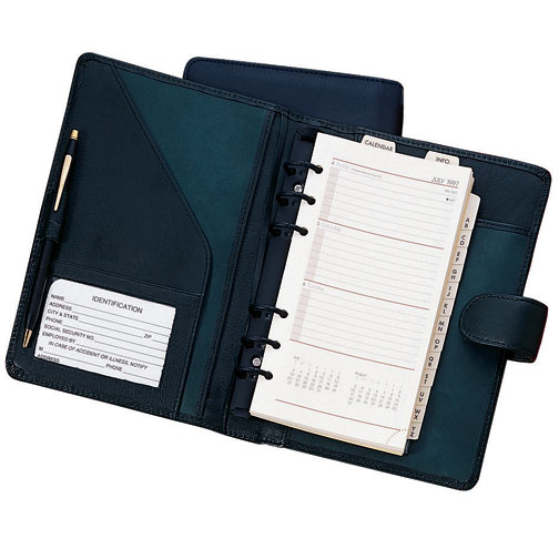 This organizer features a magnetic closure, leather placemark, pen loop (no pen included), and business card holders. Calendar included, plus address and project pages. 8" x 5 1/2" x 1 1/2". Available in black, blue, Burgundy, coco, green and tan.